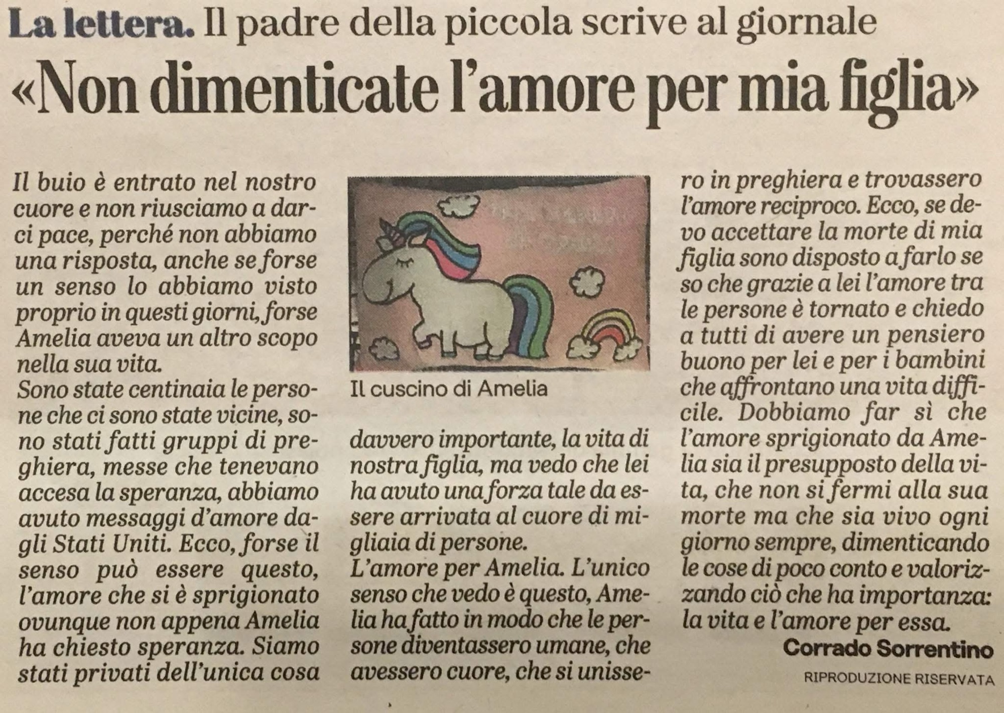 È passata una settimana ormai, anche se in realtà per noi è come se fossero quasi due, sì perché l’ultima volta che abbiamo visto Amelia cosciente era proprio due sabati fa, facevamo i compiti insieme nel salone, poi la lezione di nuoto sincronizzato e poi ancora la festa di compleanno della compagnetta di classe. Sono passate due settimane ma Amelia ora più che mai la sentiamo viva tra di noi.